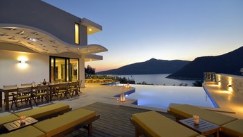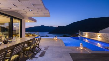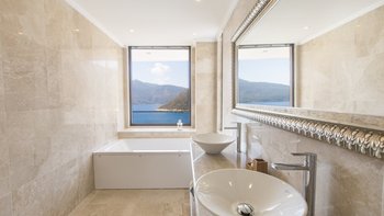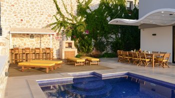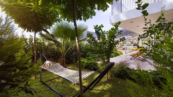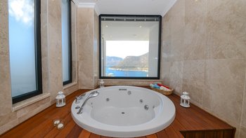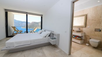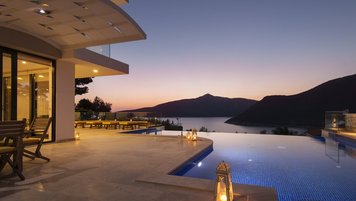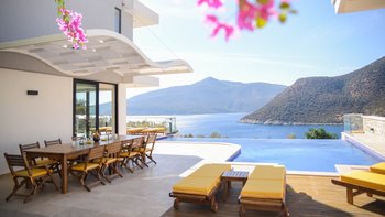 Diese Villa mit fünf Schlafzimmern bietet komfortable und geräumige Unterkünfte in bester Lage in der Nähe des Kalamar Beach Clubs, einem der beliebtesten Orte auf Kalkan. Helle, luftige Innenräume und ein außergewöhnlicher Meerblick schaffen einladende Wohnräume, ideal für Gruppen von Freunden oder Großfamilien.