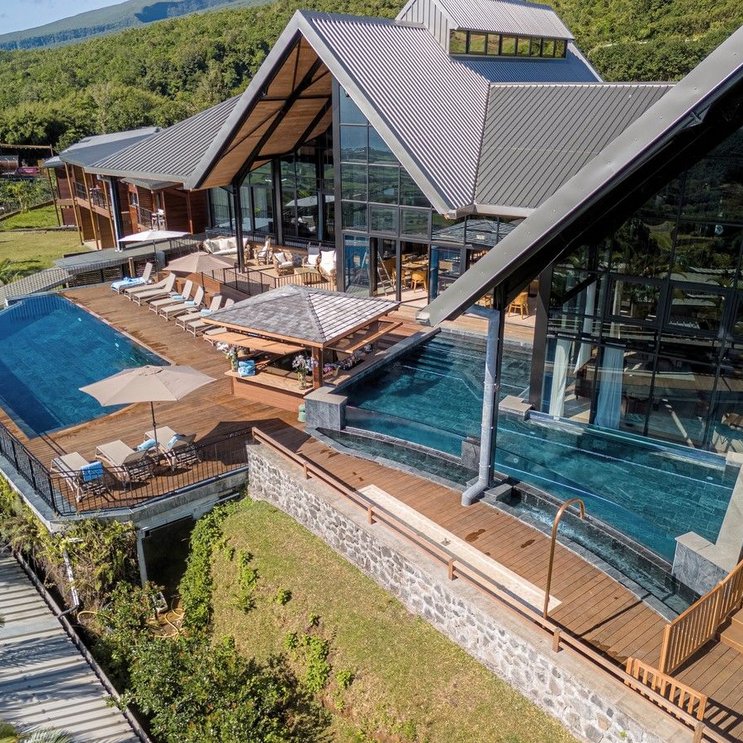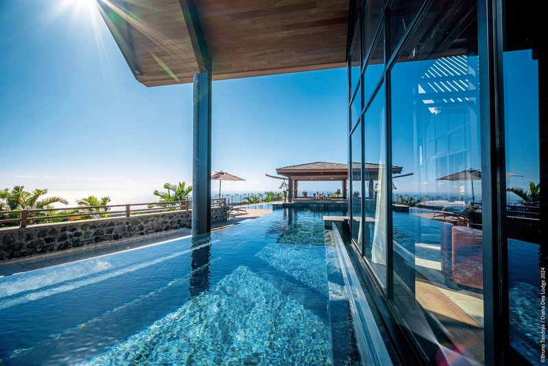 Ein elegantes Lodge-Flair mit viel Holz, Leder, ausgelegten Fellen und sehr schönen, teils natürlich belassenen Steinen, kombiniert mit einer herrlichen Poolterrasse mit einem einmaligen Blick über die Tropenlandschaft und die Küste – Wow-Faktor!