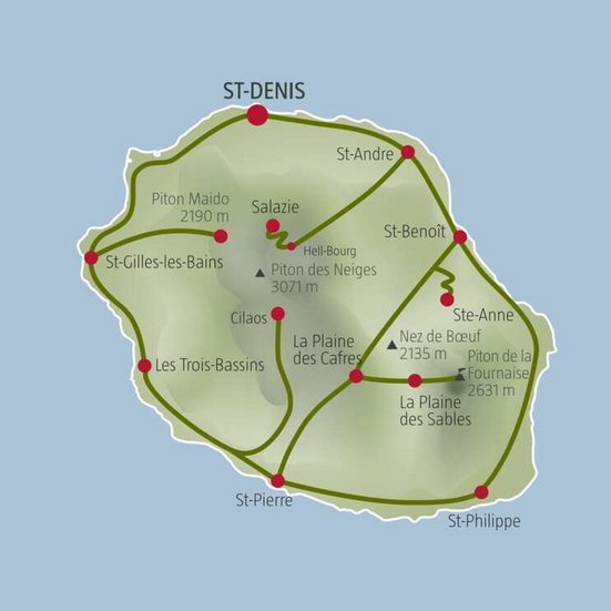 Der letzte Tag steht zur freien Verfügung. Je nach Abflug bleibt Ihnen noch Zeit, für einen Strandspaziergang oder einen unvergesslichen Helikopterflug über die Talkessel. Rückgabe des Mietwagens am Flughafen. Abflug vom Flughafen St-Denis.