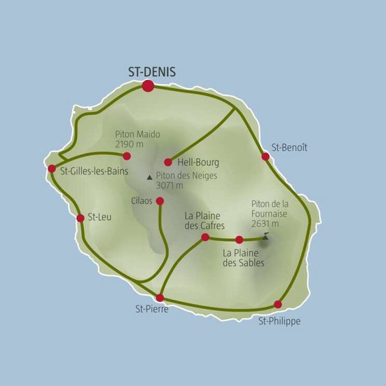 Lernen Sie die Höhepunkte La Réunions auf dieser Rundreise kennen und entdecken Sie die abwechslungsreiche Landschaft dieser einzigartigen Insel. Der Mietwagen erlaubt Ihnen, die bevorstehenden Urlaubstage ganz individuell zu gestalten. Lediglich die Übernachtungen in den inseltypischen, sympathischen kleinen Hotels sind bereits für Sie reserviert. Die zerklüftete Berglandschaft der Bergkessel Cirque de Cilaos und Cirque de Mafate, die bizarre Mondlandschaft des aktiven Vulkans Piton de la Fournaise und die Wasserfälle im Cirque de Salazie sind nur einige Highlights dieser Rundreise.