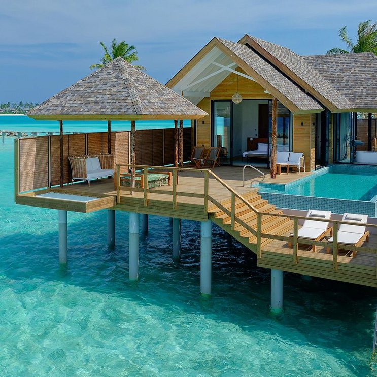 - >300 qm, Villa, freistehend, 2 Etagen, freistehend, Wasserbungalow (auf Stelzen über der Lagune), 3 separate Schlafzimmer, separater Wohnraum, Ankleidebereich, 3 Bäder, Badewanne, Regendusche, Außendusche, WC, Bademantel, Badeslipper, Haartrockner, Klimaanlage, Ventilator, Minibar kostenpflichtig, Safe, TV, Bluetooth-Lautsprecher, WLAN, Wasserkocher, Espressomaschine, Kaffee/Tee, Sonnendeck (möbliert), direkter Meerzugang, Privatpool