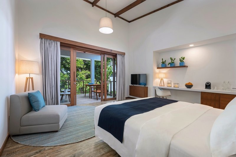 - 81-90 qm, Villa, Strandlage, Sonnenuntergangsseite, kombinierter Wohn-/Schlafraum, Ankleidebereich, Dusche, Badewanne, Außendusche, WC, Bademantel, Haartrockner, Klimaanlage, Ventilator, Minibar, Auffüllung täglich, Safe, TV, WLAN, Espressomaschine, Kaffee/Tee, Terrasse (möbliert), direkter Strandzugang