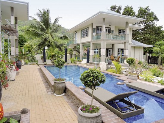 Eine Oase der Ruhe mit Blick auf die Berge von La Digue. Die Anlage liegt am Hafen – also perfekt für Angel- und Bootstouren. Und wer nicht selber kocht, lässt sich in einem der Strandrestaurants verwöhnen.