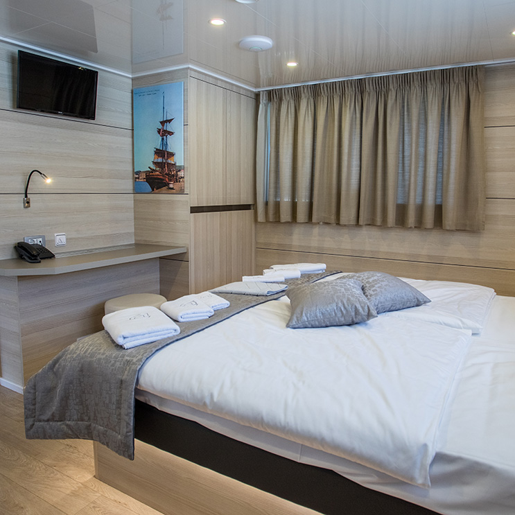Die Kabinenausstattung variiert je nach Schiffskategorie und Schiff. Unterbringung auf dem Unter-, Haupt- oder Oberdeck. Alle Kabinen mit Fenster/Bullauge, Klimaanlage, TV, Bad, Duschkabine/WC. Die Zuteilung der Kabine erfolgt vor Ort.
