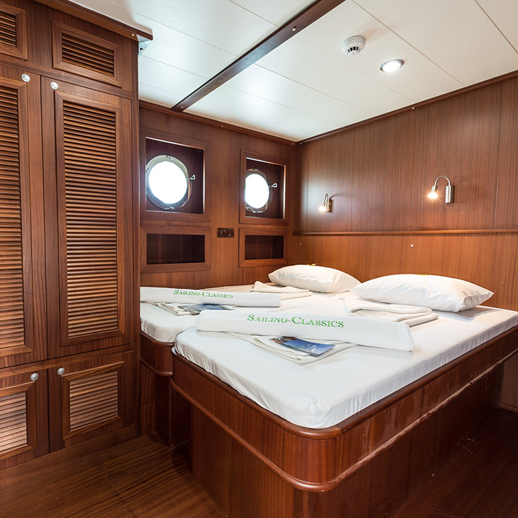 Der 38m Stagsegelschoner (Bermudaschoner) vereint herausragende Segeleigenschaften mit grosszügigen Kabinen und Komfort. Der Ausbau glänzt in hochwertigem Teak und Mahagoni und bietet Ihnen eine grosse Decksfläche zum Entspannen. Der Segler verfügt über 6 Doppelkabinen Kat. A mit Doppelbett, Klimaanlage, Bad mit Dusche, 2 Doppelkabinen Kat. B. mit Doppelbett oder Stockbetten, Nasszelle/Yachtdusche. Zu der allgemeinen Infrastruktur zählt ein Salon mit Plasma TV/DVD, eine Sitzecke an Deck, eine kleine Bordbibliothek und Admiralitätsleiter zum Baden.
