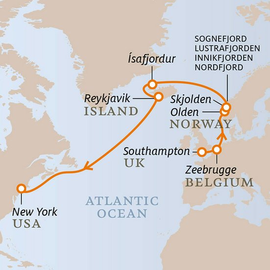 Eine Seereise über den Atlantik ist nach wie vor ein groser Reisetraum vieler Menschen. Die Traditionsreederei Cunard fährt mit ihrer majestätischen Queen Mary 2 regelmässig und auf dem direkten Weg über den Ozean. Auf dieser Reise setzt sie jedoch Akzente an besonderen Destinationen: Sie fährt tief in die norwegischen Fjorde hinein und legt später pünktlich zur Sonnenfinsternis in Island an. Dieses einmalige Spektakel am Himmel dürfen Sie nicht verpassen. Freuen Sie sich Schönheit nordischer Landschaften und gemütliche Tage auf dem weiten Ozean. Es dauert so lange, bis am Horizont die Skyline von New York das Endziel markiert.
