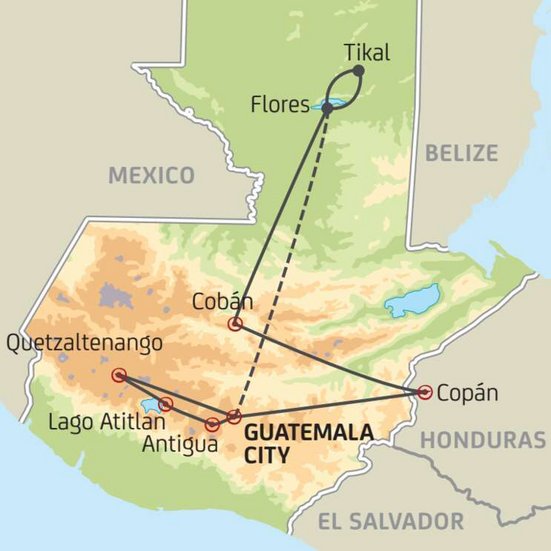 Heute erwartet Sie eine lange Fahrt. Via Sayaxche gelangen Sie nach Flores, in die Dschungel-Region Guatemalas. Am nächsten Tag steht ein einzigartiger Höhepunkt auf Ihrem Programm: Sie besichtigen das archäologische Juwel von Tikal, welches zu den wichtigsten und eindrücklichsten Maya-Stätten zählt und Heim für über 100 000 Mayas war. Die Anlage liegt gut versteckt inmitten von tropischem Regenwald. Gegen Abend fliegen Sie zurück nach Guatemala City.