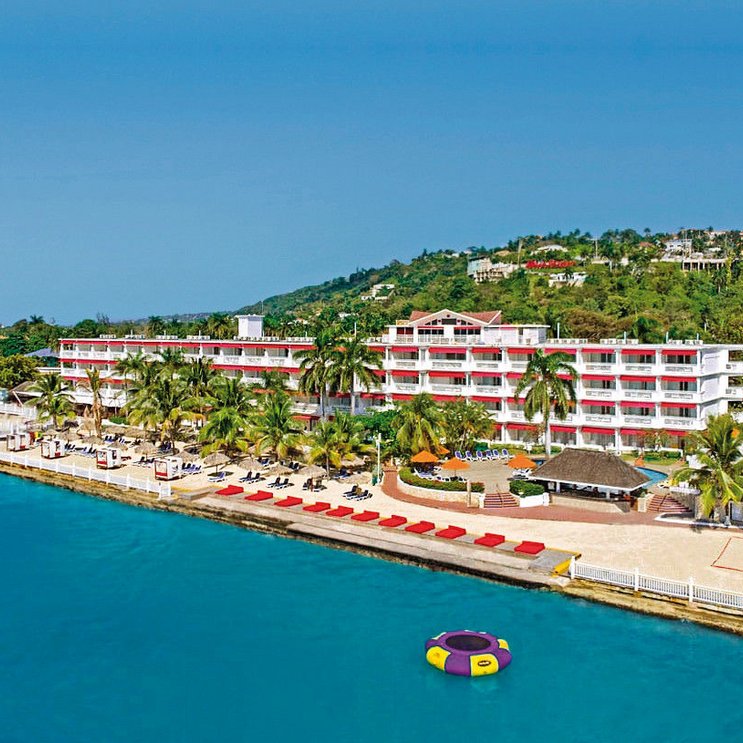 Weithin leuchtet das weiße Hotel mit den roten Markisen am Strand der Montego Bay. Die perfekte Basis um Reggae, Rastafari und die entspannte Lebensfreude der Antilleninsel zu genießen.