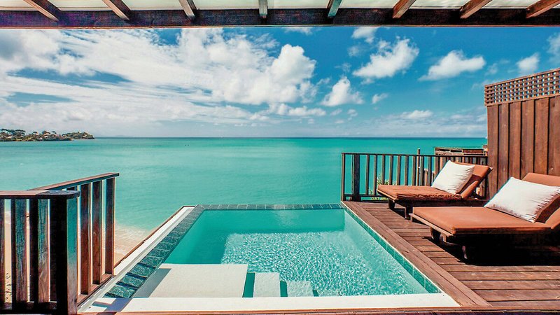 - 51-60 qm, Bungalow, Meerblick, Bettwäsche, Handtücher und Matratzen aus 100% Bio-Baumwolle, Doppelbett, Dusche, Außendusche, Haartrockner, Klimaanlage, Ventilator, Minibar, Auffüllung regelmäßig, Safe, Bügelbrett, Bügeleisen, Wasserkocher, Kaffee/Tee, Terrasse (möbliert), Privatpool