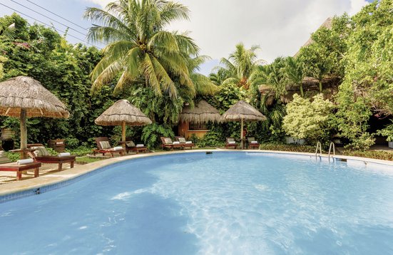 Von tropischen Pflanzen umgebener und ruhig gelegener Swimmingpool