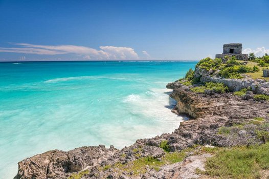 Übernahme des Mietwagens in Cancun und Fahrt nach Tulum. Besichtigen Sie die Maya-Stätte, welche hoch über der Karibik thront (65 km).