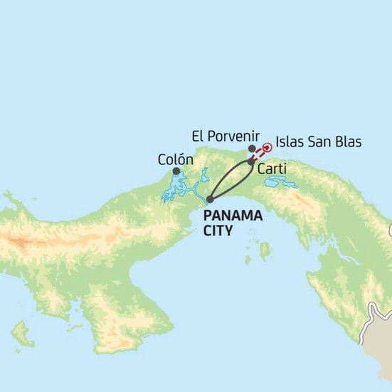 Frühmorgens werden Sie im Stadthotel in Panama City abgeholt. Die Fahrt im 4x4 Jeep führt durch das überschwängliche Grün des panamaischen Regenwaldes bis zum Hafen von Carti. Dort steigen Sie in ein Boot um, das Sie zur Guasirdub Lodge bringt. Schon die Anreise ist ein Erlebnis: türkisfarbenes Wasser, kleine Inseln mit weissem Sandstrand und Palmen säumen den Weg.