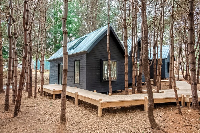 Studio-Cabins im Scandi-Stil mit offener Raumgestaltung, viel natürlichem Licht durch großzügige Fenster und Dachfenster, sowie moderner Ausstattung