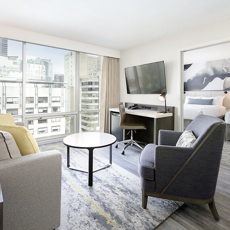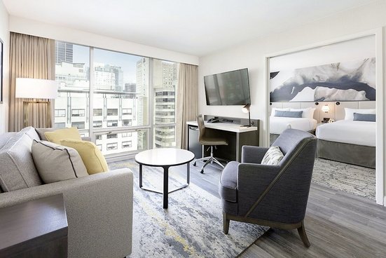 „Vancouver Lookout“ – der Aussichtsturm liegt direkt gegenüber dem Hotel und verschafft Ihnen einen grossartigen Ausblick auf die aufregende Stadt! Skytrain, Hafen, Gastown und die Einkaufsmeile Robson Street sind nah. Perfekt für den City-Trip!