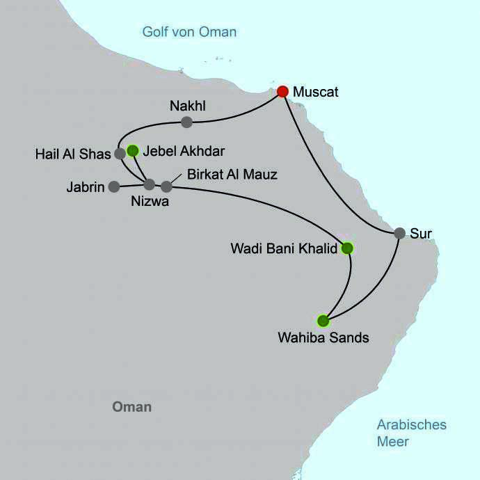 Highlights sind die imposante Sultan-Qabus-Moschee in Maskat, das historische Nizwa Fort, die dramatische Landschaft des Wadi Shab und die Dünen der Wahiba Sands. Die Bahla-Festung (UNESCO-Weltkulturerbe) und die Fjorde von Musandam bieten unvergessliche Einblicke in die Vielfalt des Landes.