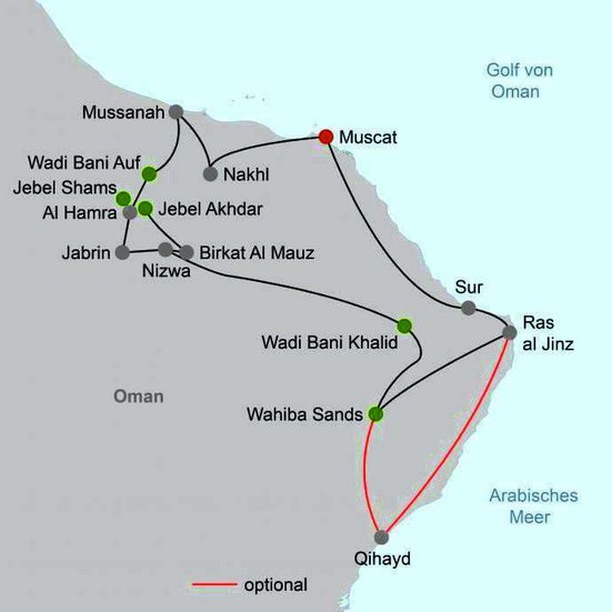 Am Morgen übernehmen Sie Ihren je nach gebuchter Variante inkludierten oder separat gebuchten Mietwagen. Es folgt das Treffen mit der örtlichen Reiseleitung, die Ihnen Tipps und Infos zur Reise gibt. Bei früher Anreise am 1. Tag kann das Treffen auch bereits dann stattfinden. Nutzen Sie den heutigen Tag, um Muscat zu entdecken. Die Hauptstadt und zugleich grösste Stadt des Oman ist wunderschön eingebettet in die Küstenszenerie und blickt auf eine tausendjährige Geschichte zurück. Was Sie auf jeden Fall einplanen sollten, ist ein Besuch der eindrucksvollen Sultan Qabus Moschee (vormittags, nicht freitags) sowie des Beit Al Zubair Museums, welches Ihnen vor allem das kulturelle Erbe des Landes näherbringt (nicht freitags). Fahren Sie entlang der Küstenstrasse zum Fischmarkt von Mutrah, dem belebten Hafenzentrum mit traditionellem Flair. Neben dem Fischmarkt ist auch der Souq von Mutrah einen Besuch wert. Beim Bummel über den arabischen Markt können Sie nicht nur das vielseitige Sortiment an Kleidung, Schmuck, Antiquitäten sowie landestypischer Handwerkskunst und Spezialitäten durchstöbern, sondern gleichzeitig das orientalische Lebensgefühl Muscats geniessen. Zuletzt empfehlen wir einen Fotostopp am Al Alam Palast, der von den aus dem 16. Jahrhundert stammenden, alles überragenden Forts Mirani und Jalali eingerahmt wird. Ca. 100 km (F)