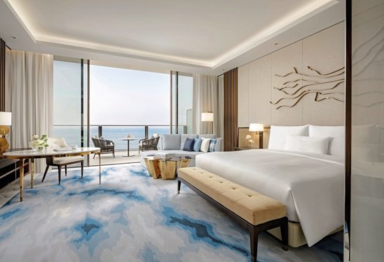 - 151-200 qm, Suite, Meerblick (zum Teil seitlich), Skylineblick, 2 separate Schlafzimmer, separater Wohnraum, Ankleidebereich, Twinbett (Queensize), Doppelbett (Kingsize), Badewanne, Regendusche, WC, Bademantel, Badeslipper, Haartrockner, Klimaanlage, Minibar kostenpflichtig, Safe, TV, WLAN, Espressomaschine, Terrasse, Butlerservice, Zutritt zur Club-Lounge, Frühstück in der Club-Lounge, Softdrinks in der Club-Lounge, abends alkoholische Getränke in der Club-Lounge, nachmittags Kaffee/Tee und Gebäck