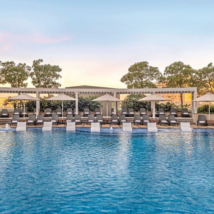 - 71-80 qm, Suite, Stadtblick oder Flussblick (zum Teil), 1 separates Schlafzimmer, separater Wohnraum, Schreibtisch, Badewanne, Regendusche, WC, Klimaanlage, Minibar kostenpflichtig, Safe, Bügelbrett, Bügeleisen, TV, WLAN, Wasserkocher, Kaffee/Tee, bodentiefe Fenster, reichhaltiges Frühstücksbuffet im Hauptrestaurant sowie ein vollwertiges Abendessen inkl. unbegrenzten Hausgetränken von 18:00 bis 20:00 Uhr und Zugang zur Club-Lounge von 12 bis 22 Uhr inkl. Softdrinks, Kaffee & Tee. Je nach Auslastung des Hotels kann das Abendessen entweder im Hauptrestaurant oder in einem anderen Restaurant (Information beim Check In vor Ort) angeboten werden. Eine Auswahl des Restaurants ist nicht möglich, Kostenloser Zutritt zum Grand Hyatt Waterpark (1 x pro Aufenthalt), Mindestaufenthalt 4 Nächte