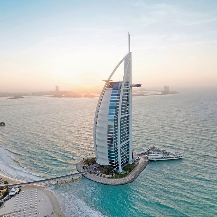 Luxuriöses Suitenhotel, das durch seine einmalige Architektur zu einem Wahrzeichen Dubais geworden ist. Auf einer kleinen Privatinsel vor der Küste des Jumeirah Strandes gelegen, bietet es Luxus pur und gilt als eines der besten Hotels der Welt.