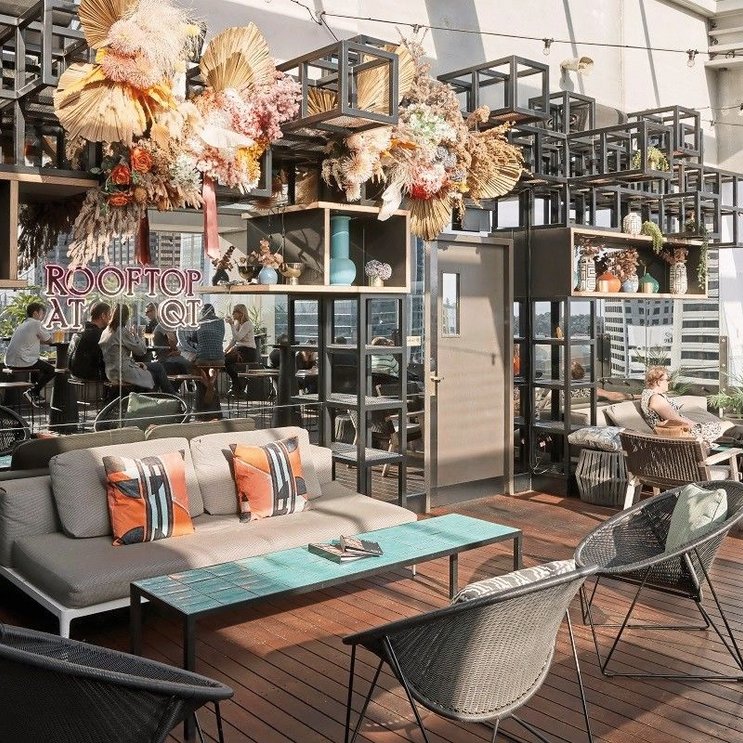 Rooftop-Bar mit Blick auf die Skyline von Perth