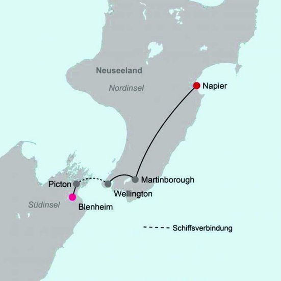 Das kleine Städtchen Martinborough kann mit kolonialem Charme und rund 20 Weingütern aufwarten, die sich alle gut vom Ortskern erkunden lassen. Martinborough hat ein warmes Mikroklima und in Ost-West-Richtung ausgerichtete Hügel. Nahezu alle Weingüter liegen auf schmalen Streifen um die Nord-und Ostseite der Stadt sowie am Dry River im Süden der Stadt. Sie alle folgen ausgetrockneten Flussbetten, die einen für den Weinbau geeigneten Boden haben. Auch ein Besuch des Olivenhains oder eine Wanderung durch die Weinberge könnten auf Ihrem Programm stehen. Gönnen Sie sich zum Abschluss des Tages einen Besuch in einem der ausgezeichneten Restaurants. (F)