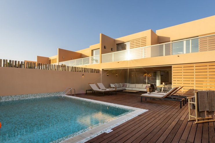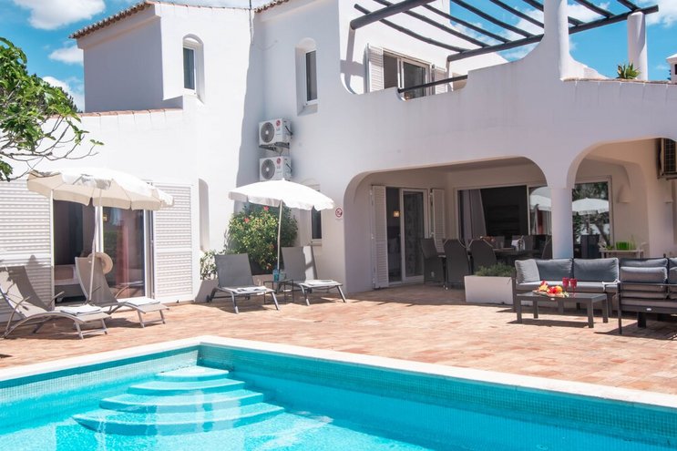 Nur wenige Schritte vom goldenen Sandstrand von Salgados entfernt, verbindet diese moderne Villa elegantes Design mit entspanntem Leben an der Algarve und bietet einen privaten Rückzugsort in der Nähe von Restaurants, Bars und Freizeiteinrichtungen.