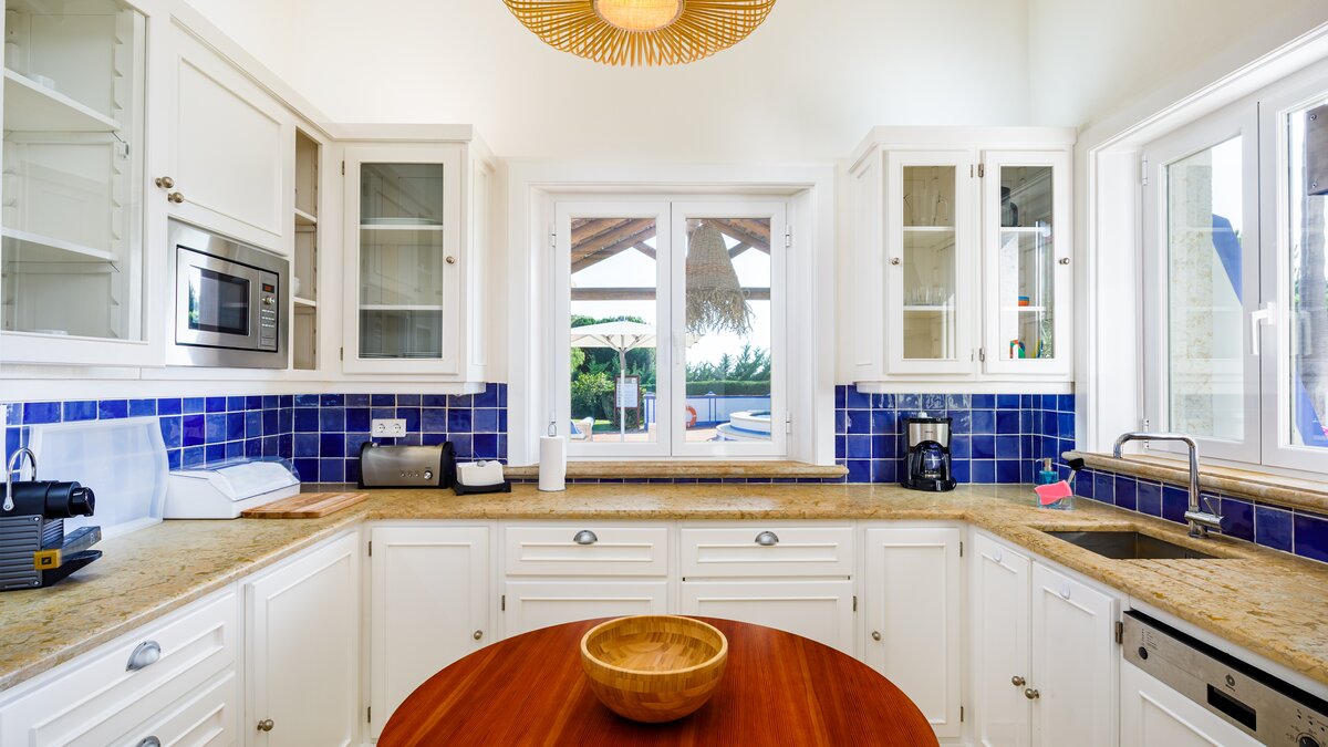 Diese Familienvilla ist in den traditionellen portugiesischen Farben hellblau und weiß gehalten und befindet sich in idealer Lage in Gehweite zu den nahe gelegenen Geschäften und Restaurants im malerischen Fischerort Olhos d’agua. Dessen Innere ist geschmackvoll mit kalkweißen Wänden und weichen Möbeln auf kühlen Marmorböden eingerichtet. Der große Innen-Esstisch ist ideal für ein offenes Wohnen konzipiert und teilt sich viel Platz mit einer bequemen Sitzgruppe und einem großen Fernseher unter hohen Gewölbedecken. Eine moderne Küche mit einem kleinen Frühstückstisch und Blick auf die Terrasse, während drei helle und luftige Schlafzimmer mit eigenem Bad das Anwesen vervollständigen.