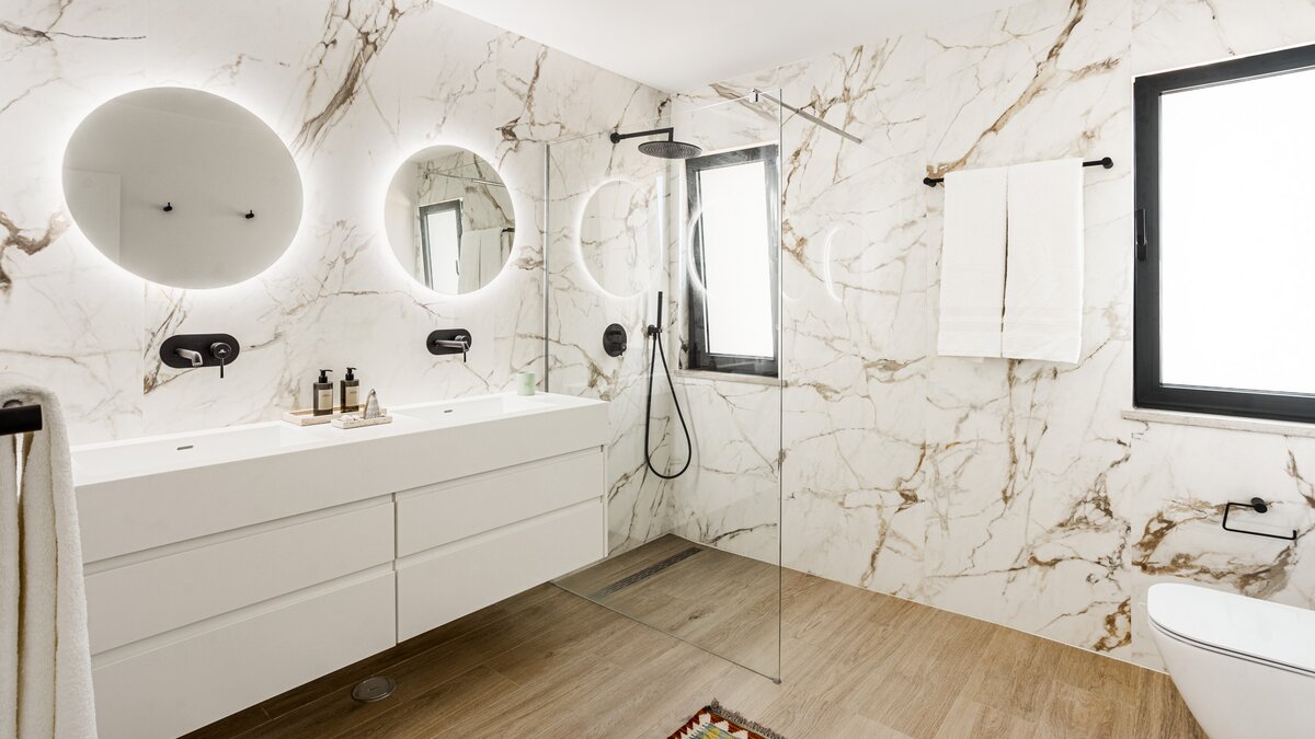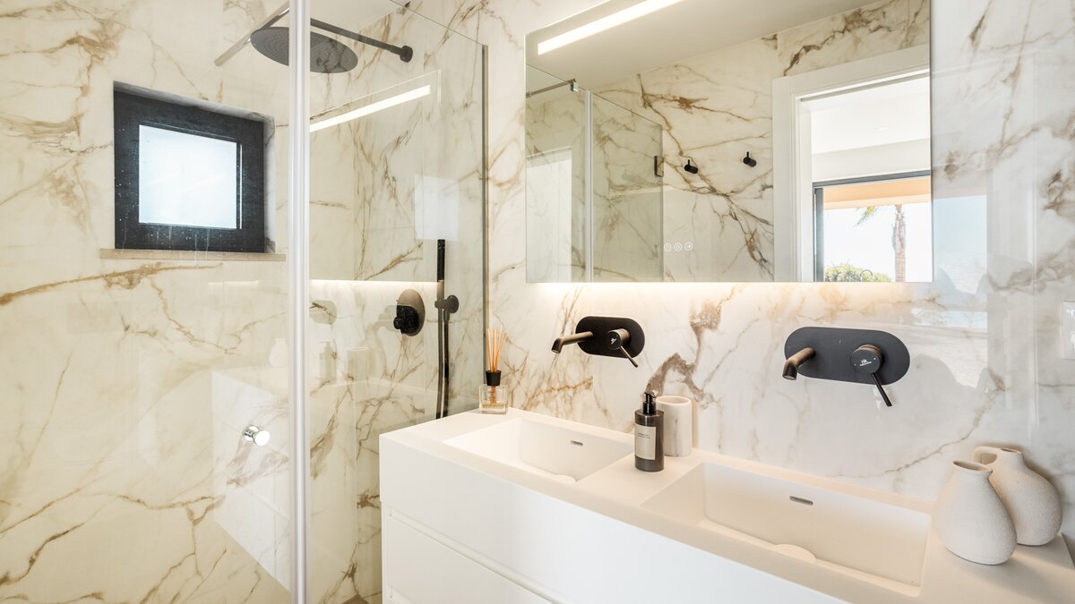 Im Inneren empfängt Sie die Villa mit weitläufigen, lichtdurchfluteten Wohnbereichen, die sich direkt auf die Terrasse öffnen und eine harmonische Verbindung zwischen dem Interieur und der spektakulären Umgebung schaffen. Deren moderne Küche ist komplett für Gourmet-Mahlzeiten ausgestattet, während die geräumigen Ess- und Wohnbereiche ideal sind, um sich mit Freunden und Familie zu unterhalten oder zu entspannen. High-End-Ausführungen und durchdachte Designakzente im gesamten unteren Bereich setzen einen Ton von schlichtem Luxus. Weiters auf dieser Etage befinden sich drei Schlafzimmer, jedes mit eigenem Bad und direktem Zugang zum Außenbereich.