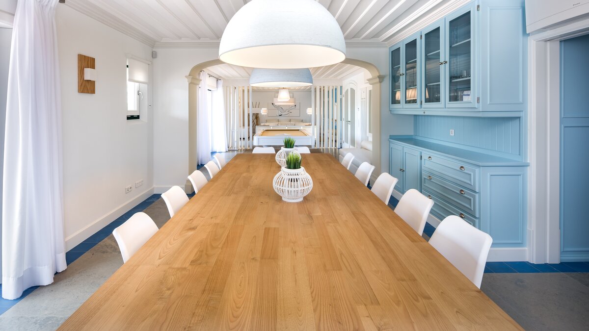 Diese kürzlich erbaute Villa ist eine ansprechende Mischung aus traditioneller Architektur und modernem Interieur in einer beneidenswerten Hügellage mit herrlichem Blick über die Landschaft. Eine geräumige und moderne Küche führt zu einem offenen Grundriss Wohn-/Essbereich und einem Spielzimmer mit Billardtisch, während der Schlafbereich aus drei Doppelzimmern und einem Zweibettzimmer besteht, alle mit Bad oder Dusche en suite. Deren Innenräume sind in einem beruhigenden Farbschema mit kühlen Blautönen, Weißtönen und neutralen Farben gehalten, die an das Meer erinnern.