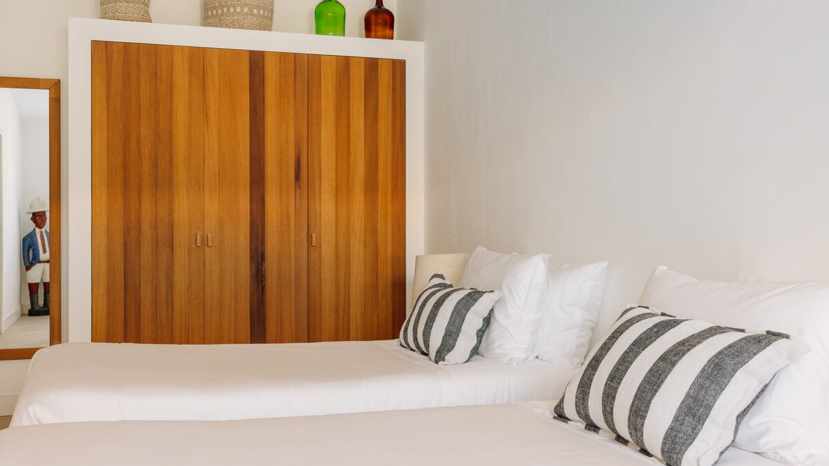 Im Inneren ist der OFFENER GRUNDRISS Wohn-, Ess- und Küchenbereich ein wahrer Anblick. Dieser weitläufige Raum besteht aus hochwertigen Möbeln in einem minimalistischen und modernen Stil. Französische Türen erstrecken sich an der Rückwand dieses Raumes und bieten direkten Zugang zum Pool und zum Essbereich im Freien. Weiters gibt es drei Doppel- und zwei Zweibettzimmer, alle mit eigenem Bad und alle mit viel Tageslicht. Ein Kinoraum befindet sich ebenfalls auf dieser Etage.