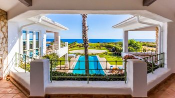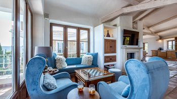 Im Obergeschoss beeindruckt die Villa weiterhin mit einem großzügigen, OFFENER GRUNDRISS Wohnraum, der für gesellige Momente und Familienfeiern konzipiert ist. Deren raumhohe Fenster lassen viel Tageslicht herein und bieten einen Panoramablick auf das Meer, während der angrenzende Essbereich und die stilvolle Lounge eine entspannte und dennoch elegante Atmosphäre schaffen. Ebenfalls auf dieser Etage befinden sich zwei weitere Schlafzimmer mit Doppelbett, beide mit Kingsize-Bett und eigenem Bad ausgestattet. Deren Hauptschlafzimmer verfügt über einen umlaufenden Balkon, der den idealen Ort für morgendliches Yoga oder einen Sundowner mit Aussicht bietet.