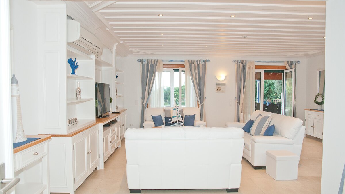 Die wunderschöne Villa Ermione liegt privat im Grünen und hinter großen Rasenflächen und ist wie ein Hauch von frischer Luft. Mit Blick auf das Meer aus der oberen Etage und Blick auf das glitzernde Blaue zwischen Palmen und Pinien bietet auch das schicke Interieur ein ausgesprochen maritimes Flair, von Dekor und Möbeln in sanftem Blau und Weißen bis hin zu ausgewählten Artefakten, die die Küste zelebrieren, und einer Klimaanlage, die die salzige Meeresbrise ergänzt. Deren Villa ist sowohl für den Innen- und auch den Außenbereich gut geplant und verfügt über fünf Schlafzimmer mit Bad, die mit erfrischender Einfachheit gestaltet sind; eine geräumige Frühstücksküche, ein elegant übersichtliches Esszimmer und ein kühles, ruhiges Wohnzimmer, das sich auf eine überdachte Terrasse öffnet.