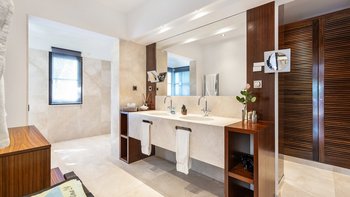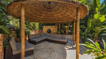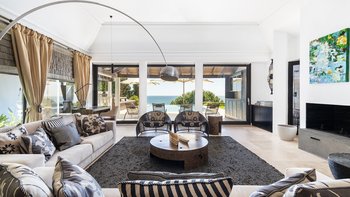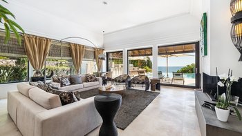 Perfekt über einem halbprivaten Sandstrand gelegen, mit weitläufigen Rasenflächen, die zum Meer hinuntergehen, bietet dieses herrliche Anwesen einen beneidenswerten Luxus, der nichts dem Zufall überlässt. Dessen Inneneinrichtung mit asiatischen Akzenten und interessanten Pais wird mit subtilen Naturtönen aufgeweicht und mit kräftigen Rottönen erwärmt, während die Außensofas auf einer offenen Terrasse mit sommerlichen Farben und hellen Kissen durchzogen sind. Deren Wohnzimmer verfügt über Terrassentüren in dunklen Kolonialfarben mit einem Flair von italienischem Design, die auch im Esszimmer zu finden sind. Sanft Beigetöne werden von bunten Kissen begleitet, die eine warme und behagliche Atmosphäre schaffen.