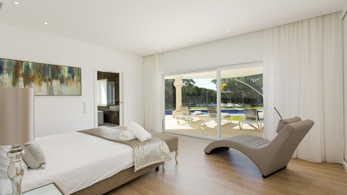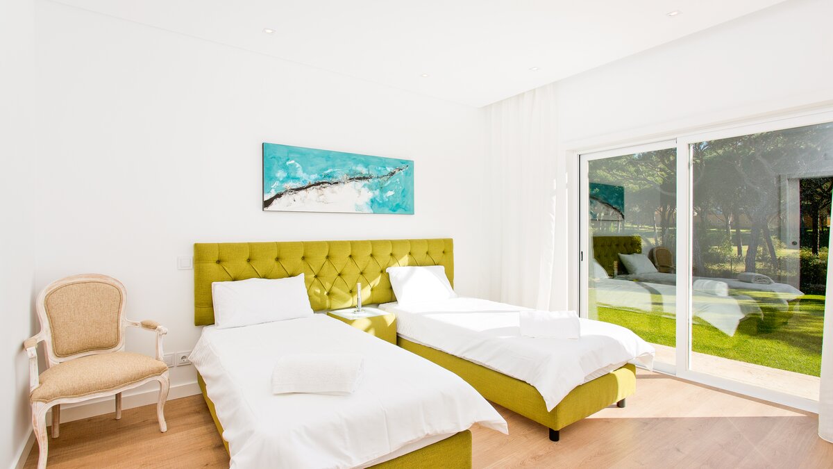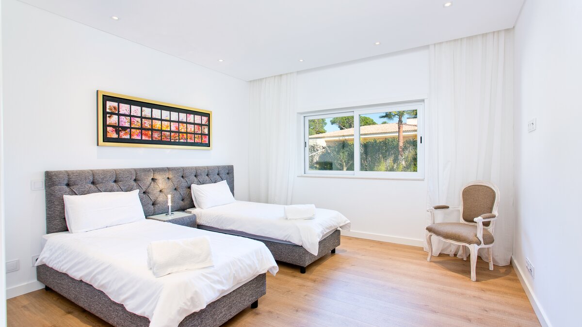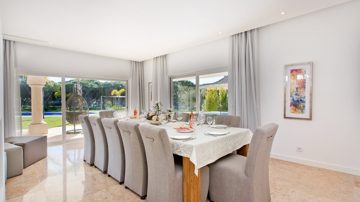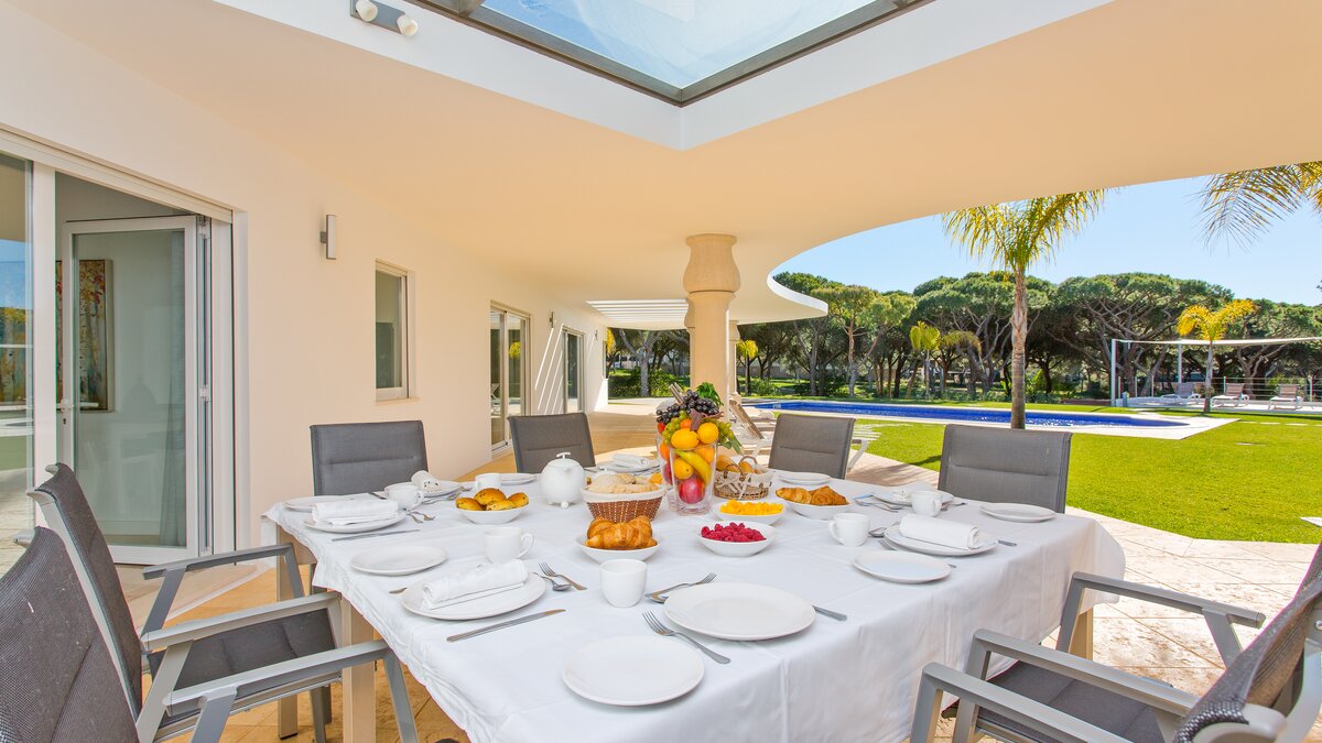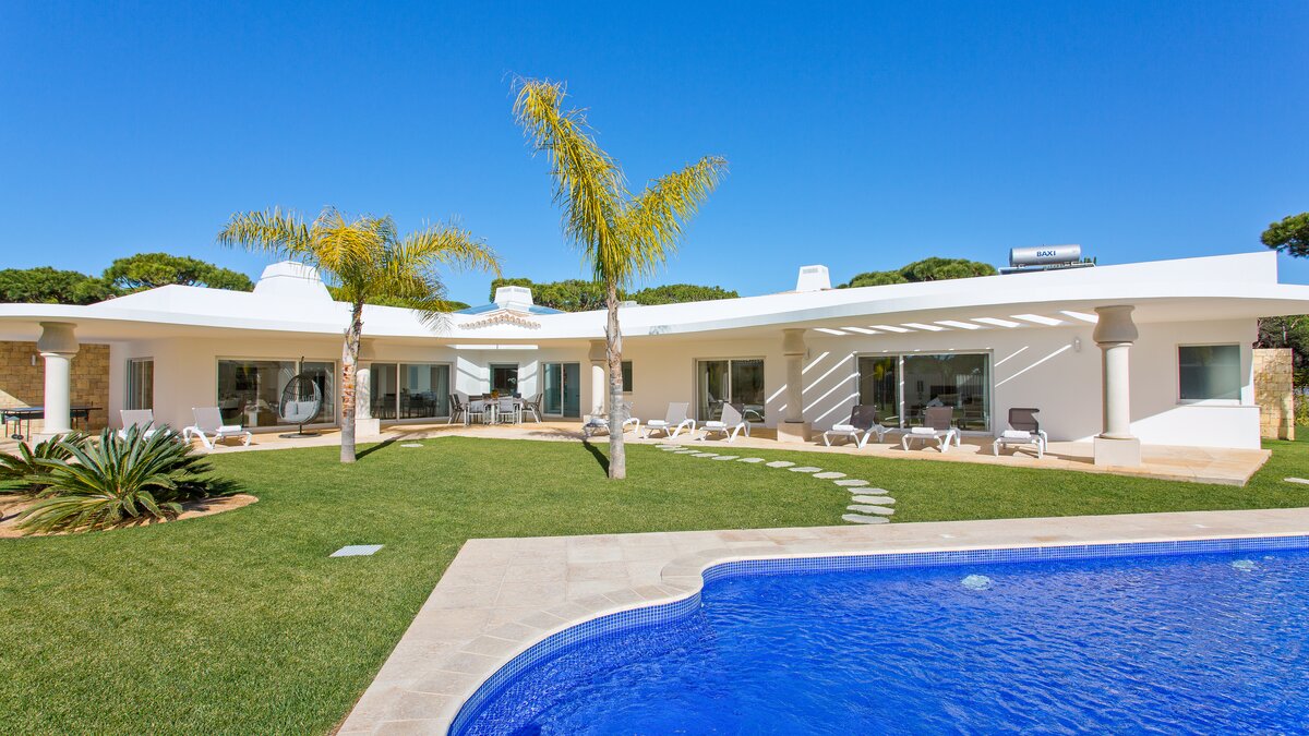Die schicke, helle und moderne Villa Omar genießt eine beneidenswerte Lage in einer exklusiven Wohngegend, umgeben von den Grünflächen des Golfplatzes. Dessen architektonisches Design hat ein fast futuristisches Flair. Denen geschwungenen, schattigen Terrassen bieten attraktiv eingerichtete Bereiche für Mahlzeiten im Freien und zum Entspannen. Sie blicken auf lange Rasenflächen mit jungen Palmen und mediterranen Pinien. Dies ist die Kulisse für den einladenden Pool der Villa, der mit Mosaikfliesen in markantem Tiefblau gesäumt ist, und für einen eingebauten Grill für ein gemütliches Mittagessen mit der Familie. Die Unterkunft im Erdgeschoss der Villa umfasst ein großes Wohn-/Esszimmer und eine elegante Küche mit Frühstückstheke sowie zwei Doppel- und zwei Zweibettzimmer, jeweils mit eigenem Bad oder Dusche. Im unteren Erdgeschoss befindet sich ein Spielzimmer mit TV und Billardtisch, und es gibt zwei weitere Schlafzimmer, ideal für Kinder. Deren vollklimatisierte Villa befindet sich 6 km von den Restaurants und Geschäften von Vilamoura und 7,5 km vom Yachthafen und dem Strand Praia Falesia entfernt.