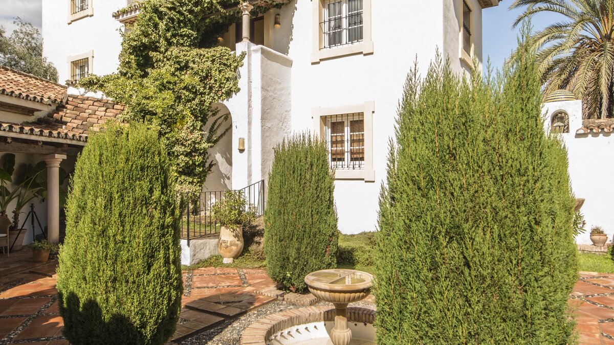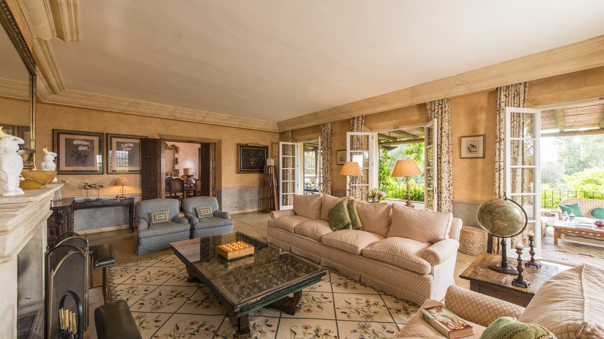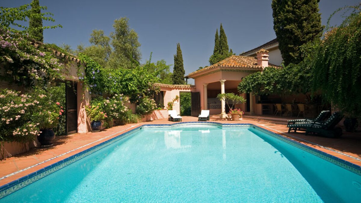 Die massive Holztür, die den Zugang zum Cortijo bewacht, der schattige Innenhof mit seinem zentralen Brunnen und die umliegenden Orangenhaine und halbtropischen Gärten sind alle unverkennbar andalusisch, aber wenn Sie diese herrliche Familienvilla betreten, könnte es sich um ein schönes altes englisches Landhaus handeln. Geräumige Zimmer mit warmen getönten Wänden sind mit Blumen- und Pastelltönen eingerichtet, die Holzbalkenküche harmoniert mit modernem Komfort und ein offener Kamin bildet den Mittelpunkt eines mühelos eleganten Wohnzimmers. Denen Schlafzimmer verteilen sich auf drei Etagen und das Turmhaus, und ein kleines Wohnzimmer kann für größere Familien umgewandelt werden. Der beheizbare Swimmingpool (auf Anfrage) liegt im Grünen und verfügt über einen gut durchdachten Speisesaal auf der Poolterrasse. Geschäfte und Restaurants, Tennis, Segeln und Windsurfen befinden sich in 5 km Entfernung in Sotogrande.