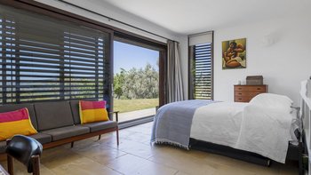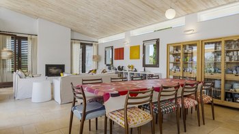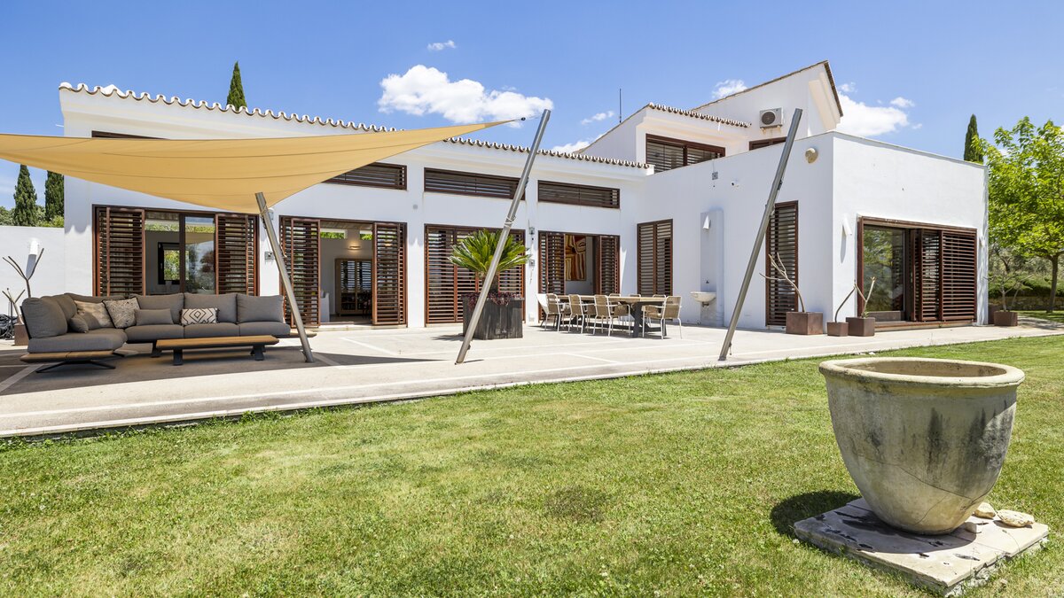 The villa’s design celebrates the light and landscape of Andalucia. Inside, the vast open-plan living space is defined by soaring ceilings, eclectic artwork, and full-length glass doors that dissolve the boundary between the interior and the sun-drenched patios. Whether you are retreating to a quiet library nook with a book or hosting a movie night with the cinema projector, the house has a relaxed, easygoing feel that makes everyone feel right at home.