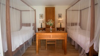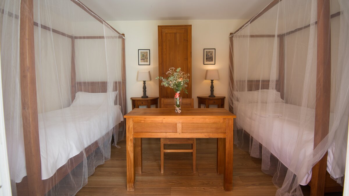 Im Außenbereich neben dem Pool befinden sich die beiden anderen Schlafzimmer, beide mit zwei Einzelbetten und direktem Zugang zum Poolbereich. Denen Gäste können auch die Yoga-Terrasse und den großen Privater Pool nutzen, während Sie auf den Liegestühlen faulenzen und Ausflüge zur Poolbar unternehmen. Ein Außenbereich mit Grill ist ebenfalls vorhanden, wo die Gäste eine Handvoll köstlicher Mahlzeiten im Schatten genießen können.