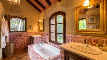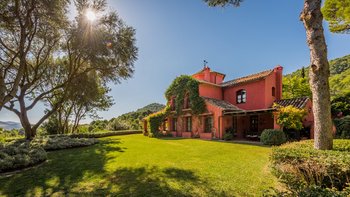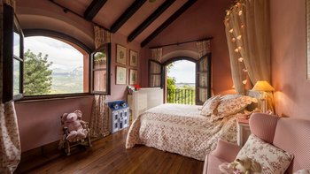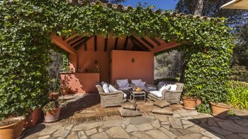 Eines der fünf Schlafzimmer, die Master-Suite verfügt über ein Himmelbett und ein großes Bad en suite. Und draußen gibt es überdachte Terrassen, die zum Entspannen und Essen eingerichtet sind, einen charmanten Innenhof, weitläufige Gärten mit Rasen und Bäumen und einen Freiform-Infinity-Pool in Waldlandschaft mit gepflasterter Terrasse und Pavillon-Bar am Pool. La Casa Roja liegt in ruhiger Abgeschiedenheit 11 km von Casares und 14,5 km vom historischen und malerischen Gaucin entfernt.