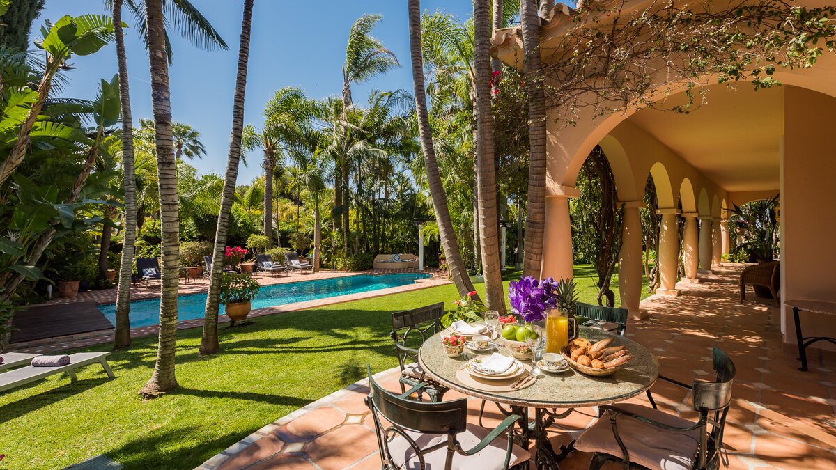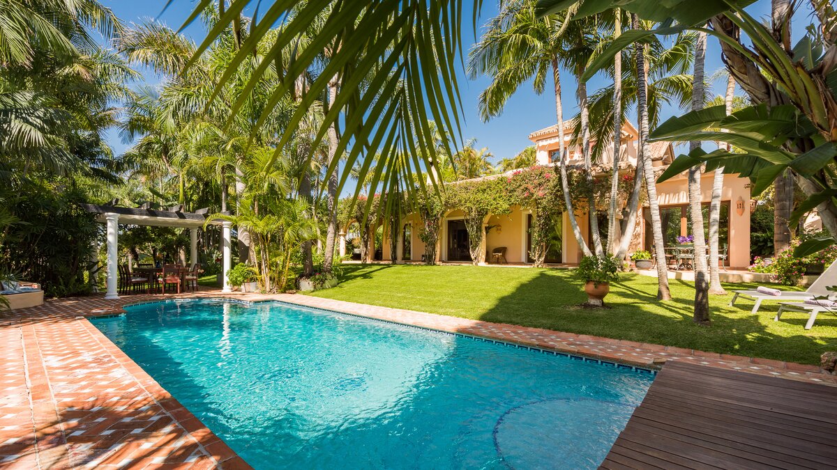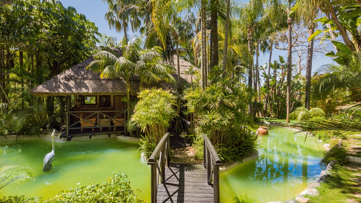 Fast versteckt in ruhigen und tropischen Gärten, wo hoch aufragende Palmen aus gepflegten Rasenflächen emporragen, bringt diese spektakuläre Familienvilla in Andalusien mehr als einen Hauch von Bali nach Puerto Banus.