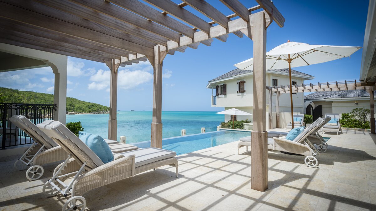 Diese opulente Villa mit fünf Schlafzimmern befindet sich direkt an der Spitze von Antigua und bietet Panoramablick auf das Meer und exquisites Design.