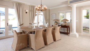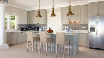 Wenn die Gäste die Villa betreten, werden sie von einer offenen Grundriss Küche, einem Ess- und Wohnbereich begrüßt. Dieser Raum wurde auf höchstem Niveau fertiggestellt und hat eine makellose und moderne Aura. Dessen Handvoll umlaufender französischer Türen schaffen Grenzen von natürlichem Licht und bieten einen tadellosen Panoramablick auf das Meer. Deren Küche ist komplett ausgestattet mit einer Küchenzeile und einer Frühstückstheke, während das Ess- und Wohnzimmer aus weichen und geschmackvollen Möbeln besteht. Darüber hinaus verfügt diese Etage über zwei geräumige Kingsize Doppelschlafzimmer mit Bad en Suite und direktem Zugang zum Außenbereich.
