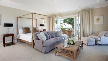 Im Obergeschoss befinden sich zwei weitere Doppel-Kingsize-Schlafzimmer mit Bad en Suite. Mit vier Himmelbetten, einem neutralen, beruhigenden Interieur und französischen Türen, die auf einen Sitzbalkon mit Meerblick führen, sind diese Zimmer der Inbegriff von Luxus.