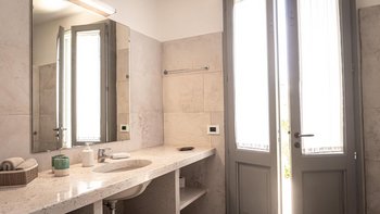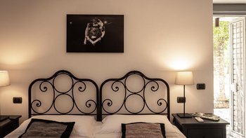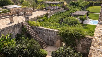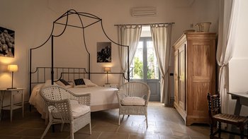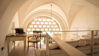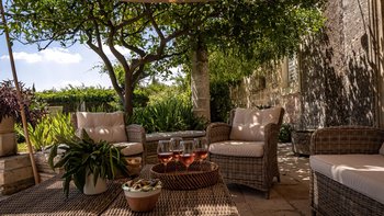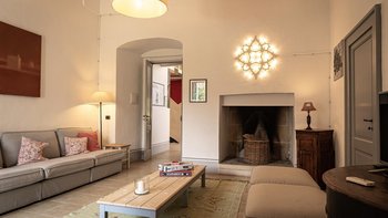 Im Erdgeschoss der Villa, durch den Eingang, wo zeitgenössische Kunst von David Tremletts ausgestellt wird, werden die Gäste durch den Essbereich und die Treppe, die zu einem Mezzanin-Arbeitsbereich führt, willkommen geheißen. Weiters gibt es eine Küche im traditionellen und rustikalen Stil und einen großen Wohnbereich mit komfortablen Möbeln, einem offenen Kamin und französischen Türen, die zum Innenhof führen. Zwei Doppelschlafzimmer mit Kingsize-Bett befinden sich ebenfalls auf dieser Etage; mit Dusche en Suites und direktem Zugang zum Außenbereich.