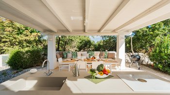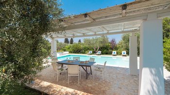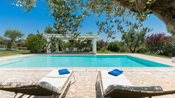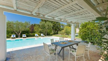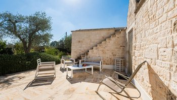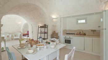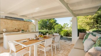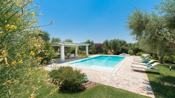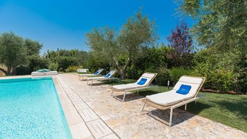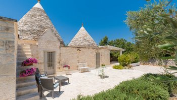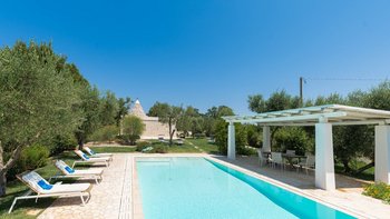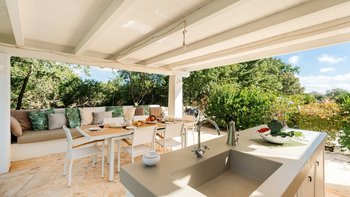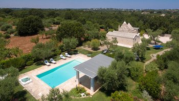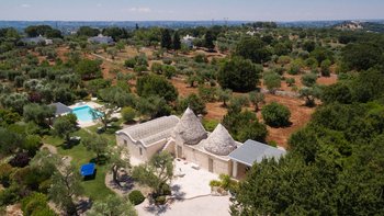 Das Valle d’Itria ist eine stimmungsvolle Gegend, die für ihre kegelförmigen Trulli-Wohnungen bekannt ist und die ideale Lage für ein Festmahl an charmanten Städten und eine Auswahl an herrlichen Stränden bietet. Obstgärten und Weinberge tanken die Sonne in ihrer fruchtbaren und fotogenen Landschaft und bilden den Rahmen für diese bezaubernde Familienvilla in Apulien. Ihre zwei hohen Kegel und die weiß getünchten Mauern, die einen Meter dick sind, sorgen für eine erfrischende Kühle und einen bemerkenswerten Charakter. Denen Villa ist wie der Stolz des lokalen Eigentümers im Landhausstil eingerichtet und verfügt über eine Küche, ein Wohnzimmer und einen kleinen Sitzbereich, wo farbenfroh gepolsterte Sitzgelegenheiten in einen architektonischen Bogen eingebaut sind. Die drei Schlafzimmer sind mit fröhlicher Einfachheit eingerichtet, und es gibt zwei Duschräume und zwei überdachte Essterrassen, von denen eine jetzt eine beeindruckende, voll ausgestattete Außenküche mit Insel hat. All dies befindet sich in einem weitläufigen Garten mit Rasenflächen, Kakteenbeeten und Blumenbeeten, die den Swimmingpool mit einem angrenzenden Pavillon zwischen den Olivenbäumen umgeben.