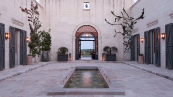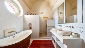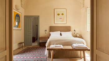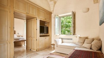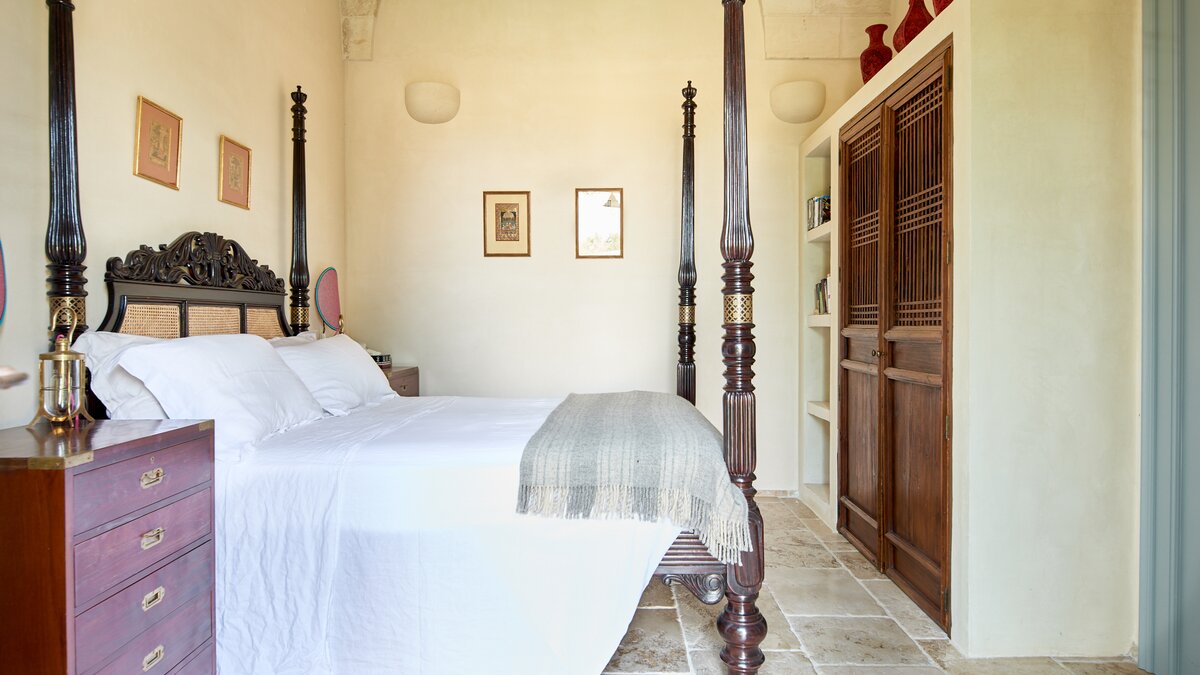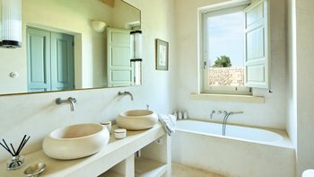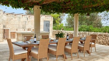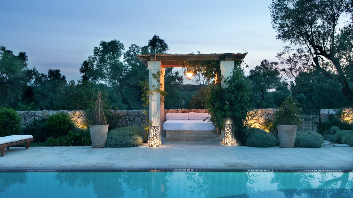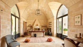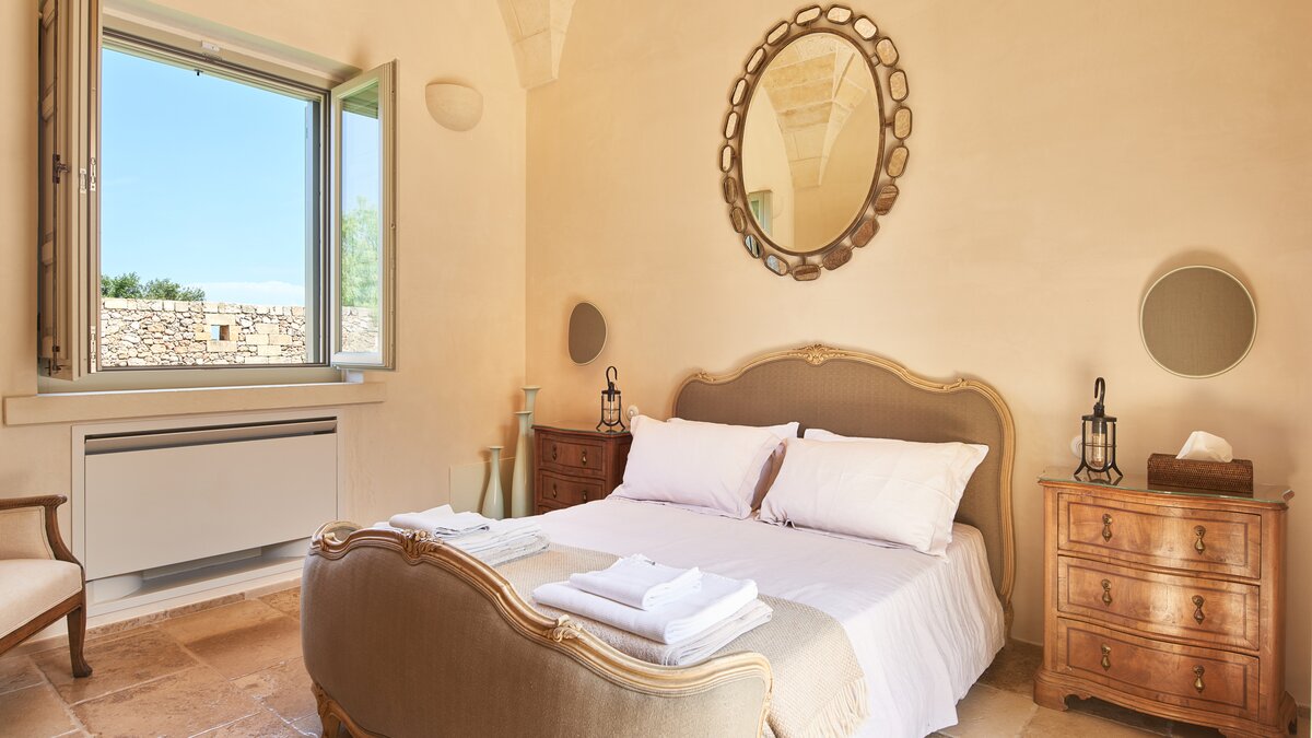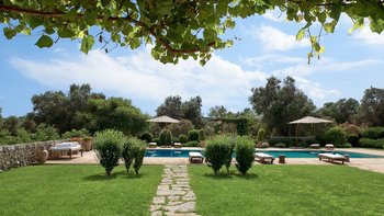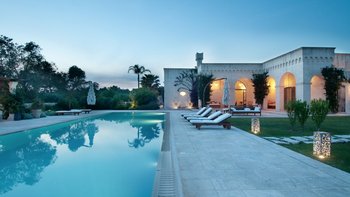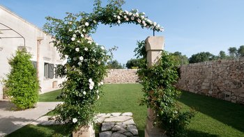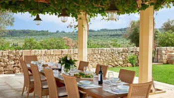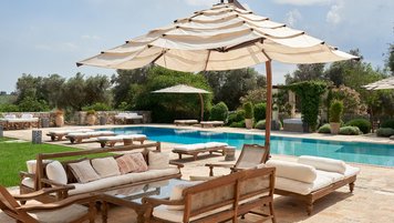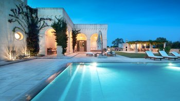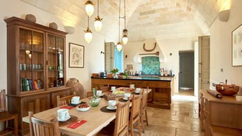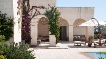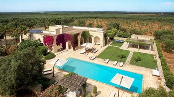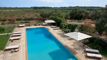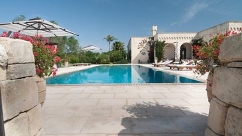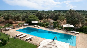 Die Masseria Coloniale erhebt sich aus grünen Gärten mit Rasenflächen, Sträuchern und Bergsteigern und bietet einen weiten Blick auf die umliegende Landschaft. Sie ist eine wunderschöne, blasse Steinvilla, deren Loggia-Bögen und der Brunnenhof die ganze Anmut der traditionellen apulischen Architektur widerspiegeln. Bewachsene Pergolen und Steinplattenböden die kühle Eleganz der Villa fortsetzen, wo das zurückhaltende Styling eine schöne Mischung aus modernen Möbeln in sanften Grau- und Cremetönen, rustikalen Chicstücken und mehr als ein Hauch von Romantik ist. Mit einem Kühlsystem und WLAN im gesamten Gebäude verfügt die einstöckige Villa über fünf übersichtliche Schlafzimmer, stilvolle Bad- / Duschräume, ein luftiges Wohnzimmer mit Türen zu zwei Seiten und eine charmante und gut ausgestattete Essküche. Eines Schlafzimmer befindet sich im Haupthaus und zwei in jedem der Schlafzimmerflügel. Im Freien gibt es eine Sommerküche mit Gasgrill und Holz-Pizzaofen, und es gibt einen überdachten Essbereich mit Blick auf die Rasenflächen am Pool, ein versenktes Trampolin und Tischtennis sowie und einen wunderschönen Pool, der 18 Meter lang ist.