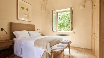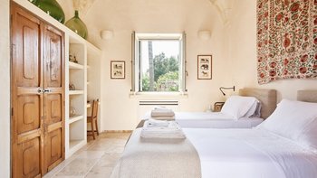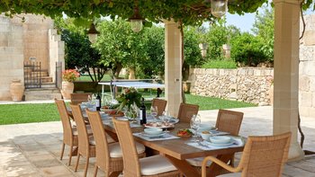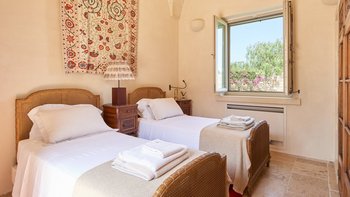 Für Belegung von bis zu 10 plus 2 Kindern auf Tagesbetten im Hauptschlafzimmer stehen 5 Schlafzimmer im Haupthaus zur Verfügung. Die Trullo Suite bleibt geschlossen.