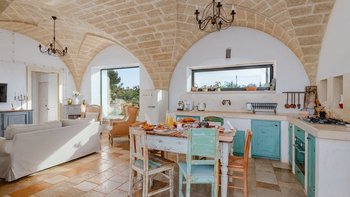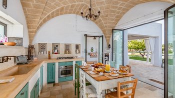 Umgeben von weitläufigen Gärten und Olivenhainen, ist die Masseria del Faro das perfekte Ziel für einen ländlichen Rückzugsort für Familien und Gruppen von Freunden gleichermaßen. Mit ihren frischen Weißen, freiliegendem Mauerwerk und einem aufgeräumten Stil verbindet diese neu renovierte Villa traditionelle apulische Steinarchitektur mit rustikal-schickem Innendekor und dem Komfort moderner Einrichtungen. Deren für das Leben im Freien konzipierte überdachte Terrasse mit einem möblierten Wohnbereich und einem frischen Esstisch im Freien neben dem Grill bietet direkten Zugang zu zwei Schlafzimmern in einem Abschnitt und der offenen Küche, dem Ess- und Sitzbereich und einem weiteren Schlafzimmer im Haupthaus, das von der gegenüberliegenden Seite der überdachten Terrasse aus zugänglich ist. Beide Teile der Villa haben traditionelle Fliesenböden und freiliegende Steingewölbedecken. Aller drei Schlafzimmer haben ein eigenes Bad mit Dusche, Kingsize-Doppelbetten und zwei der drei Schlafzimmer öffnen sich zum Garten. Zwei Steinwege führen zum privaten Privater Pool wo vor kurzem eine Pergola mit Essecke, weichen Sitzgelegenheiten und Grill hinzugefügt wurde. Zu den jüngsten Verbesserungen gehört auch die Restaurierung des charakteristischen Trullo mit kleinem Doppelbett, das für junge Erwachsene geeignet ist. Die historische Stadt Morciano di Leuca und die Küstenstadt Torre Vado mit herrlichen Sandstränden, die als „Malediven des Salento“ bekannt sind, mit klaren, flach abfallenden Stränden mit kristallklarem Wasser und lebhaften Beachclubs mit Bars und Restaurants sind nur eine kurze Autofahrt von der Masseria del Faro entfernt. Weitere preiswerte Restaurants befinden sich in und um die malerischen Dörfer. Tagesausflüge und Boots- und Jachtausflüge können organisiert werden, um die wunderschöne Küste und die Meeresgrotten zu erkunden.