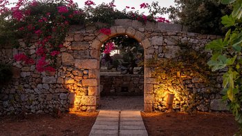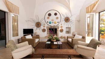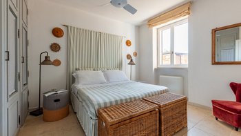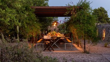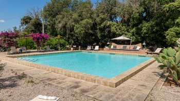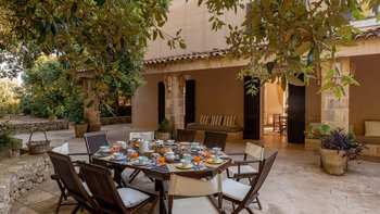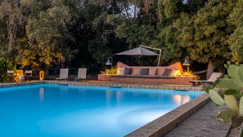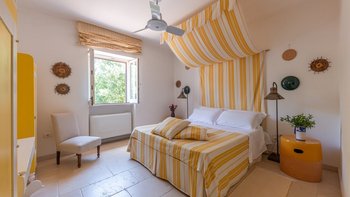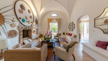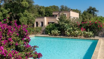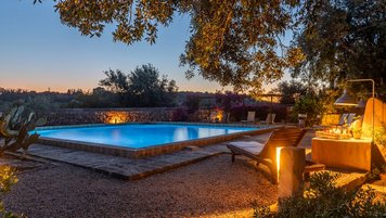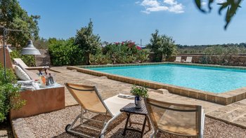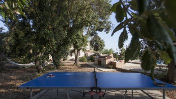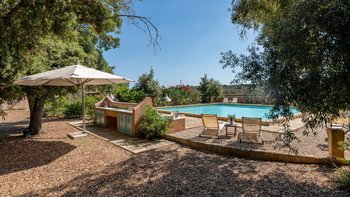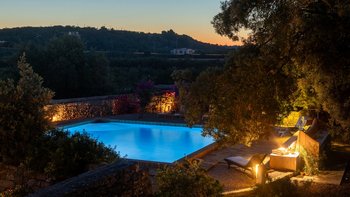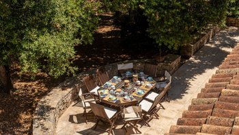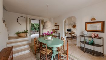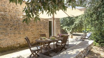 Mit seiner nach Westen ausgerichteten Terrasse, die die goldenen Farbtöne des Sonnenuntergangs genießt, und fabelhaft für das Leben im Freien eingerichtet, verbindet dieses elegante Steinhaus, das privat an einen Eichenwald angrenzt, traditionelle Materialien mit sehr individuellem Dekor und stilvollen farbenfrohen Akzenten. Dessen luftige und elegante sterngewölbte Wohnzimmer und der Essbereich fangen die kühlende Brise ein und der Essbereich öffnet sich zur Terrasse und zum Portikus an der Vorder- und Rückseite der Villa. Auf der vorderen Terrasse gibt es reichlich Sitzgelegenheiten in der Sonne und schattige Plätze, ergänzt durch einen Essbereich im Freien. Der hintere möblierte Portikus blickt auf den Eichenwald. Alle fünf Schlafzimmer sind mit Flair im eleganten italienischen Stil mit farbenfrohen Stoffen eingerichtet, aber auch von einheitlicher Größe und Standard mit viel Stauraum, Klimaanlage und eigenem Duschbad. Zwei Schlafzimmer befinden sich im ersten Stock des Haupthauses, eines mit einer großen privaten Terrasse mit Blick auf den Pool, Eichenholz und die Landschaft. Denen anderen beiden befinden sich im Erdgeschoss und sind vom hinteren Portikus aus zugänglich.