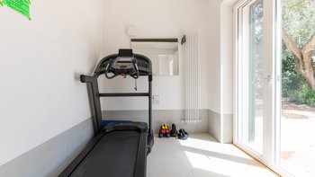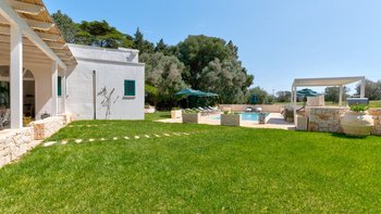 Draußen kommt die Villa voll zur Geltung. Eine weitläufige, schattige Terrasse mit Blick auf eine gepflegte Rasenfläche und den einladenden, beheizbaren Pool – der Mittelpunkt für lange, sonnige Tage. Der Poolbereich ist gut ausgestattet mit bequemen Liegen und Sonnenschirmen zum Entspannen, während die Kinder den Spielplatz unter den Pinien mit angrenzendem Trampolin und Tischtennis spielen können. Zu den jüngsten Ergänzungen gehören ein Mehrzweck-Spielplatz und eine ruhige Yoga-Shala, was die Masseria Annabella sowohl für aktive Familien als auch für Damen und Herren, die Entspannung und Wohlbefinden suchen, attraktiv macht.