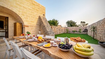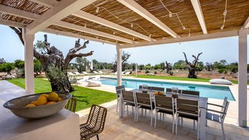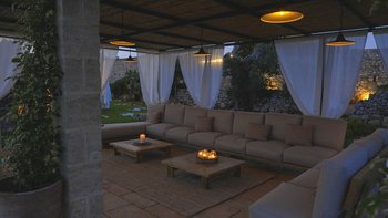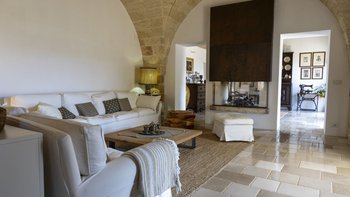 Im Inneren werden die Gäste von einem hellen und luftigen Interieur begrüßt, wo modernes Dekor und elegante Möbel eine anspruchsvolle und zugleich einladende Atmosphäre schaffen. Deren Hauptvilla verfügt über sechs wunderschön eingerichtete Schlafzimmer, von denen jedes auf einen malerischen Innenhof hinausgeht. Deren Herz der Masseria La Corte ist die moderne offene Küche und der Essbereich, der sich nahtlos an den Innenhof anschließt und einen perfekten Rahmen für Mahlzeiten im Innenhof oder Mahlzeiten im Freien unter dem Sternenhimmel schafft. Deren Wohnzimmer mit einem herrlichen Kamin an der Wand dient als zentraler Treffpunkt und strahlt Wärme und Eleganz in seinem modernen italienischen Stil aus.